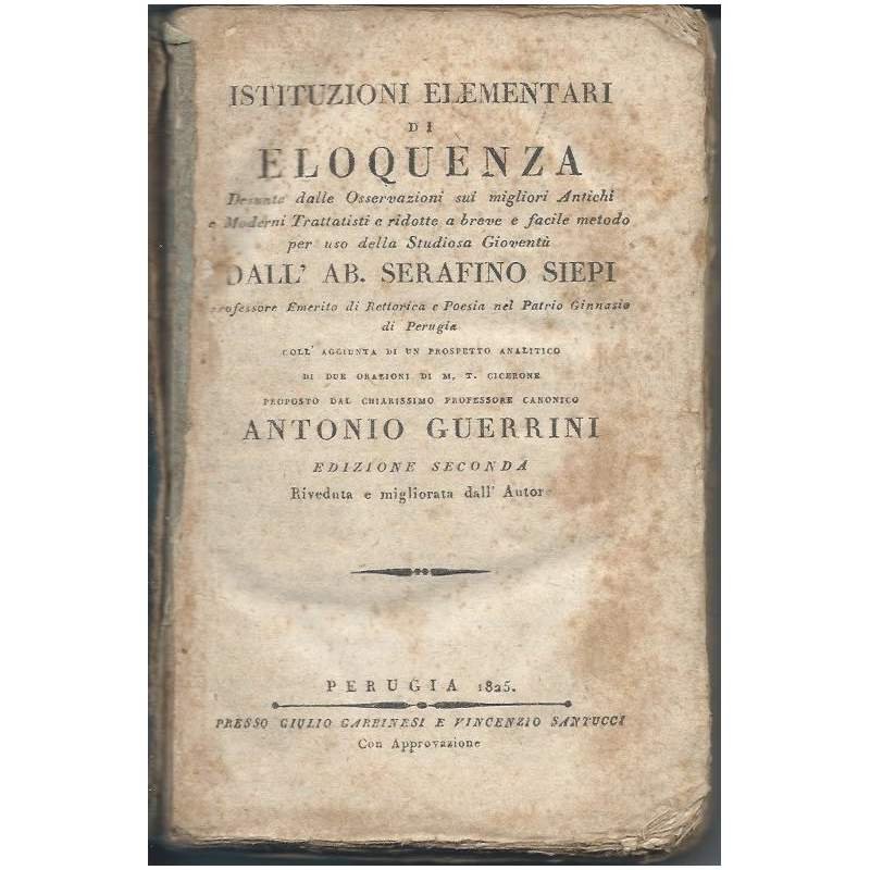 In 16, br. ed., pp. 379. Piatto ant. mancante, probabile sovracc. amatoriale incollata alla cop., pieghe e strappetti alla cop. e alle carte, fiori d'insetto al piatto post. leggera brunitura fattore tempo ai tagli e al frontespizio, fior. al frontespizio, barbe, leggere fior. e gore ad alcune carte, discrete condizioni. Istituzioni elementari di eloquenza - Desunte dalle osservazioni sui migliori antichi e moderni trattatisti e ridotte a breve e facile metodo per uso della Studiosa Gioventdell'Ab. Serafino Siepi - Professore emerito di Rotorica e Poesia nel Patrio Ginnasio di Perugia - Coll'aggiunta di un prospetto analitico di due orazioni di M. T. Cicerone proposto dal chiarissimo professore canonico Antonio Guerrini. Luogo di pubblicazione PerugiaEditore Giulio Garbinesi e Vincenzo Santucci Anno pubblicazione 1825Materia/Argomento Retorica, Eloquenza, Filosofia ***Due to bureaucratic reasons, books dated over 70 years old cannot be immediately exported, please contact us before placing the order.***