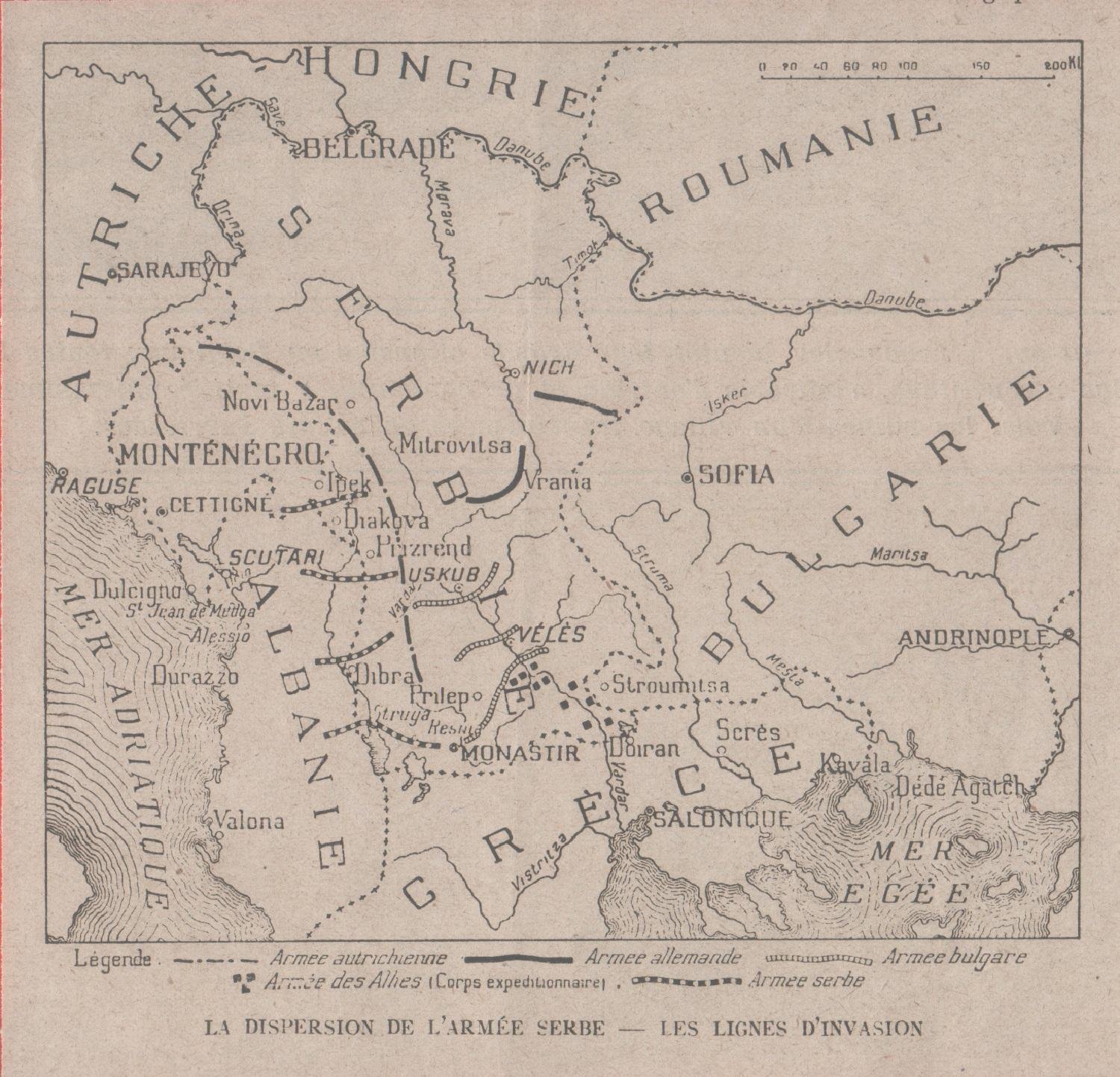 IWW. Dispersion de l'Armee Serbe Les lignes d'invasion. 1915