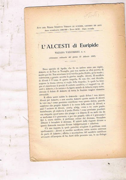 L'alcesti di Euripide (Adunanza ordinaria del giorno 21 febbraio 1932). Atti del reale ist. Veneto di Scienze, lettere ed arti. Estratto. | Libri antichi e moderni | Valgimigli Manara.