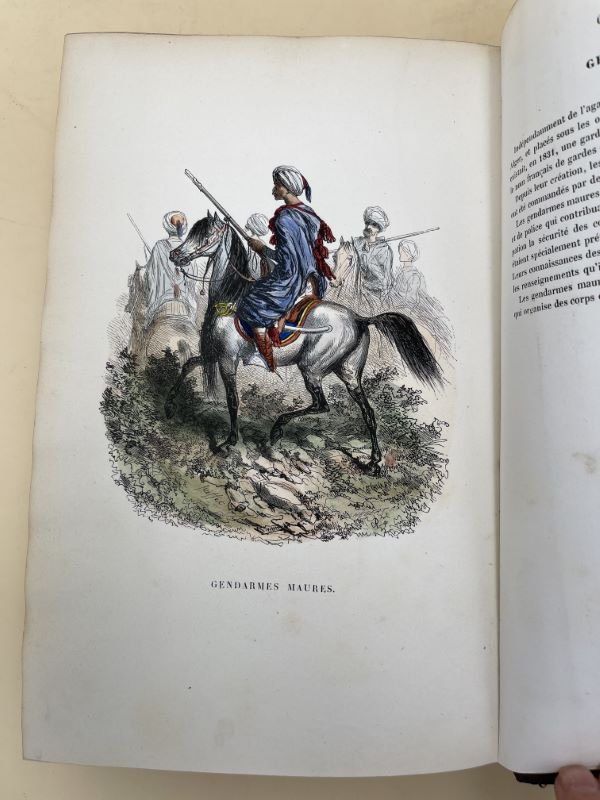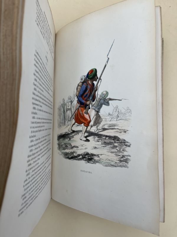 Furne et Cie 1846 Furne et Cie, 1846. In-4 relié demi-basane fauve, dos lisse très orné à long motif doré, titre doré. 637 pages. Frontispice gravé en noir et blanc. Quelques planches d'uniformes militaires en gravures couleurs. Nombreuses gravures en noir et blanc, dans et hors texte. Une carte dépliante, gravée en couleurs, en fin d'ouvrage. Vignettes par RAFFET. Ex-libris. Bel exermplaire
