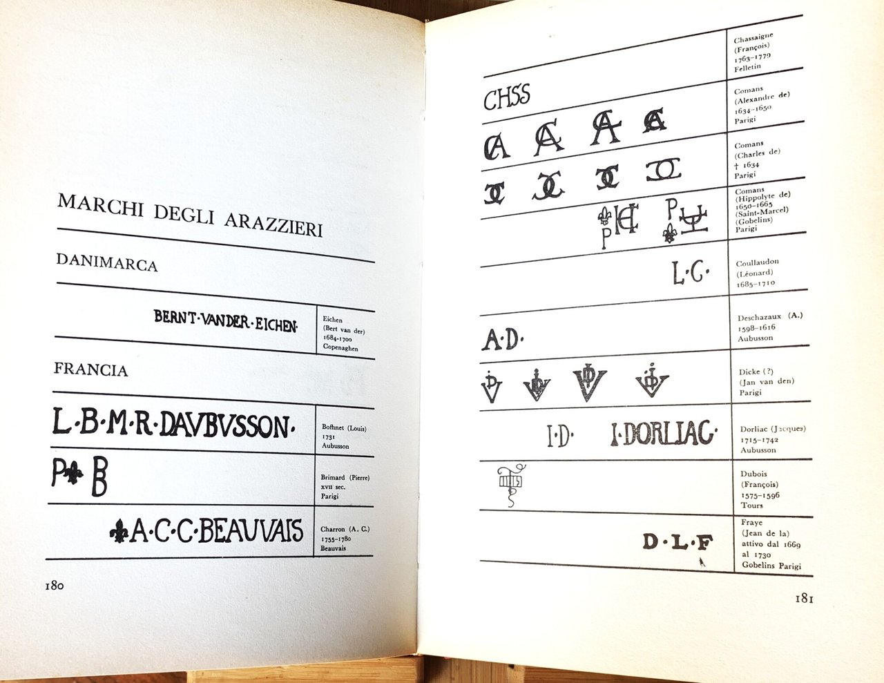 I ed.. Collana di arti decorative diretta da Guido Gregorietti "Antiquariato". VIII piccolo/ 372/ cart./ sovraccoperta patinata con grafica in azzurro/n/b e con illustrazione a colori al primo piatto (Danza campestre. Lilla: Guglielmo Werniers, ca. 1730. Antiquariato, Milano). Con 63 tavole patinate f.t. illustrate in b/n e a colori, con la riproduzione in nero dei marchi e degli stemmi di città in tavole f.t. e con figure in nero nel testo e f.t.. Stato buono (leggera usura della sovraccoperta ai margini - sovraccoperta leggermente scolorita e leggermente brunita - primo foglio di guardia e pp. 1-4 con piccoli strappi e piegature al margine esterno che non inteccano il testo - pagine brunite). Indice: Premessa; G. G. - Introduzione - Dall'XI al XIII secolo (Germania) - Il XIV secolo (Germania e Svizzera - Manifatture franco-fiamminghe - Le manifatture parigine - Norvegia) - Il XV secolo (La produzione franco-fiamminga - I laboratori italiani - Manifatture della Germania e della Svizzera - Laboratori iberici) - Il XVI secolo (Manifatture delle Fiandre - Manifatture francesi - Manifatture svedesi - Manifatture danesi - Manifatture norvegesi - Manifatture tedesche - Manifatture italiane - Manifatture spagnole - Manifatture inglesi - Manifatture polacche - Manifatture di Paesi dell'attuale Unione sovietica) - Il XVII secolo (Manifatture dei Paesi Bassi - Manifatture francesi - Manifatture tedesche - Manifatture italiane - Manifatture inglesi - Manifatture danesi - Manifatture svedesi - Manifatture norvegesi - Manifatture polacche) - Il XVIII secolo (Manifatture francesi - Manifatture italiane - Manifatture spagnole - Manifatture tedesche - Manifatture dei Paesi Bassi - Manifatture polacche - Manifatture svedesi - Manifatture danesi - Manifatture di Paesi dell'attuale U.R.S.S. - Inghilterra) - Appendice: I secoli XIX e XX (Manifatture francesi - Inghilterra) - Tecnica (Attrezzi e proedimenti della lavorazione arazziera - Caratteristiche e limiti della tecnica arazziera - Materie tessili e colori) - Marchi e stemmi di città (Marchi degli degli arazzieri) - Tavole - Bibliografia - Indice analitico.
