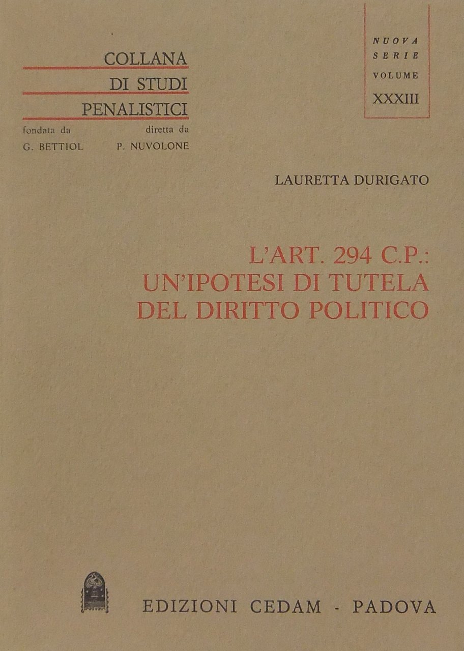 L'art. 294 C.P.: un'ipotesi di tutela del diritto politico | Libri antichi e moderni | Durigato Lauretta