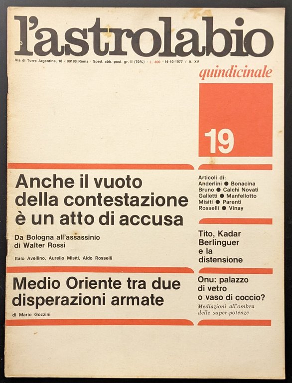 Opuscolo vintage. L'astrolabio, Roma, N. 19 - 14-10-1977. Argomento: Saggi. Autore: AA. VV. Editore: Stampa Nova A.G.E.P. Luogo: Roma. Anno: 1977. Formato: in-4°. Pagg: 40. Legatura: Punto metallico. Conservazione: buona. Illustrazioni in bn all'interno del testo. Lieve foxing al taglio.