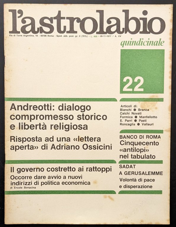 Opuscolo vintage. L'astrolabio, Roma, N. 22 - 28-11-1977. Argomento: Saggi. Autore: AA. VV. Editore: Stampa Nova A.G.E.P. Luogo: Roma. Anno: 1977. Formato: in-4°. Pagg: 40. Legatura: Punto metallico. Conservazione: buona. Illustrazioni in bn all'interno del testo. Foxing al taglio.