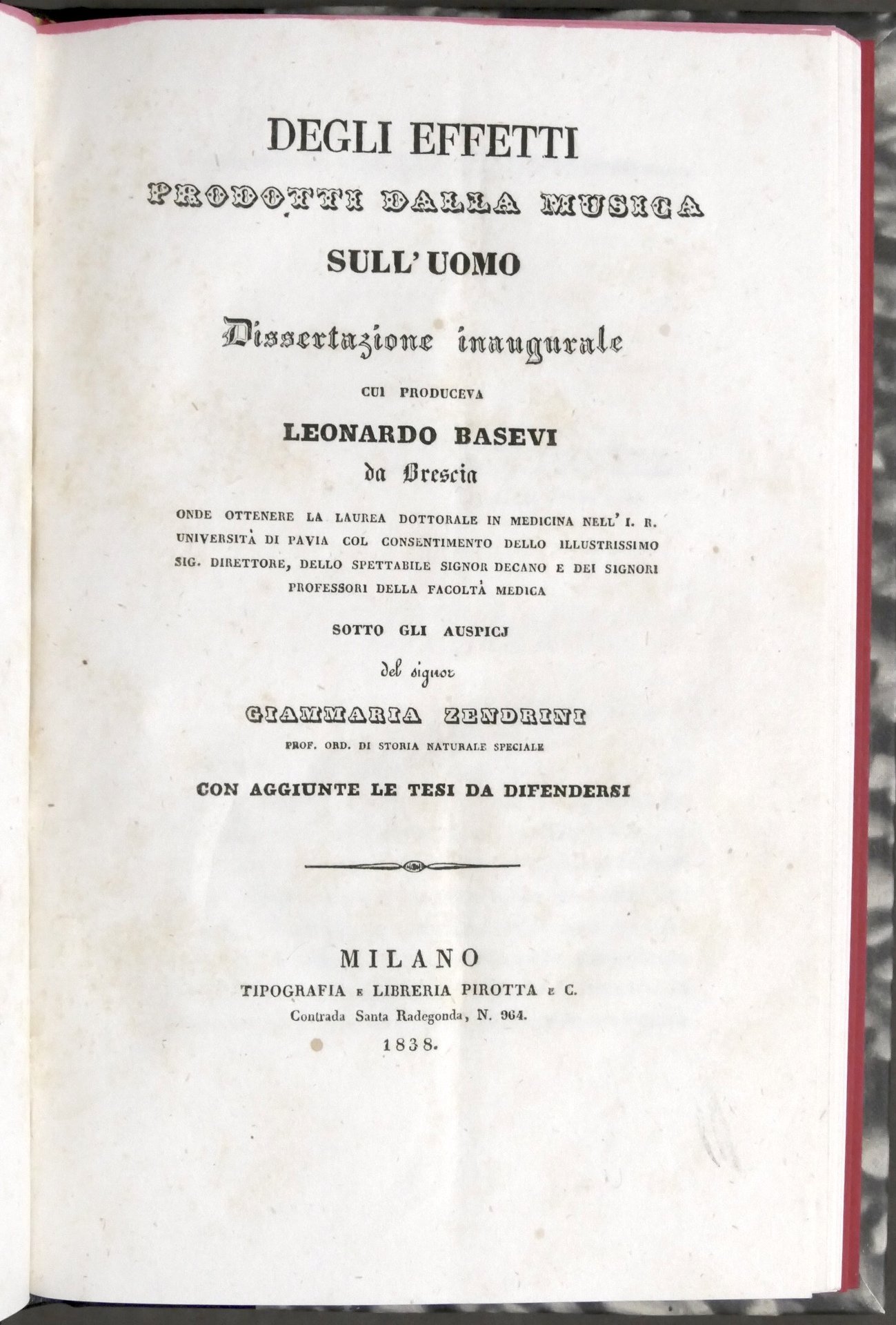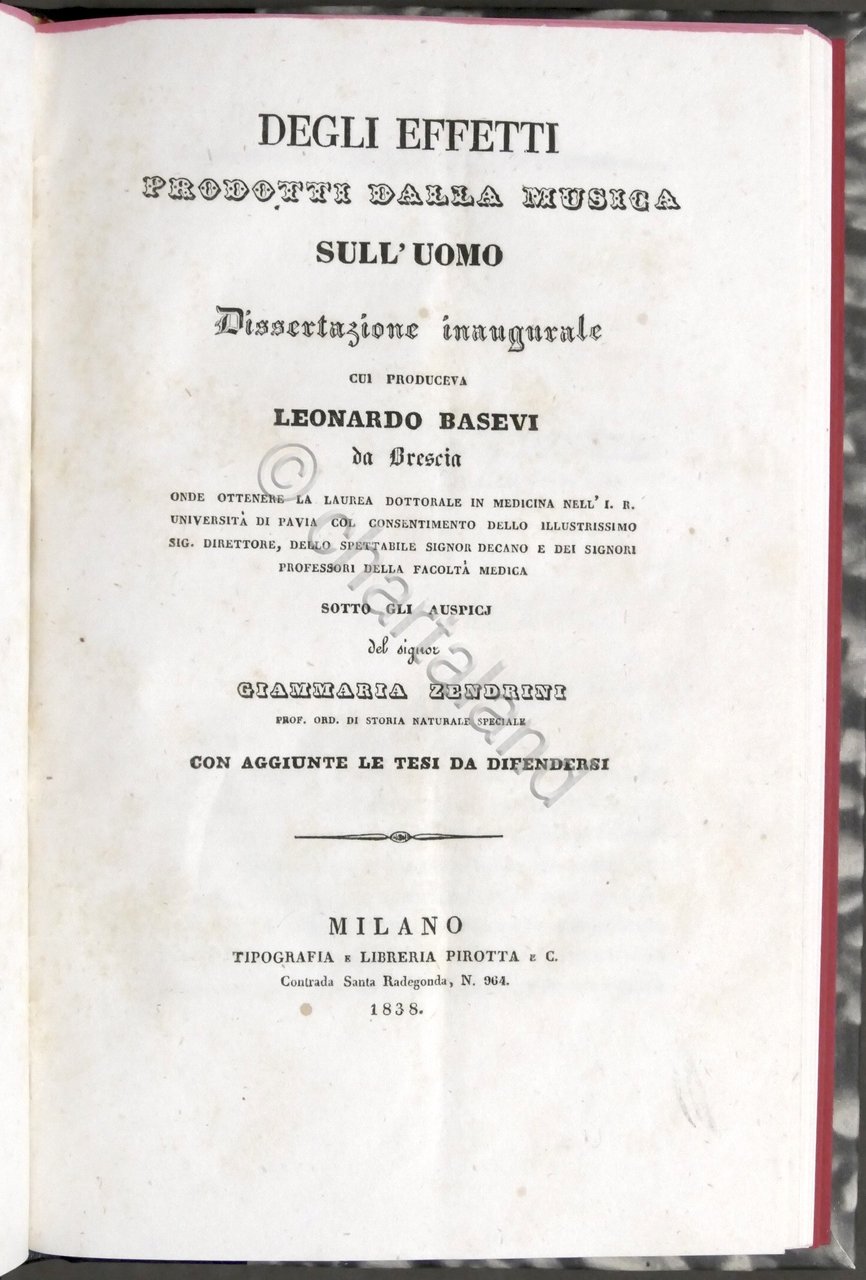 Degli effetti prodotti dalla musica sull'uomo Dissertazione inaugurale cui produceva Leonardo Basevi da Brescia Sotto gli auspici di Giammaria Zendrini Milano, Tipografia e Libreria Pirotta e C., 1^ ed. 1838 Pag. 57 Copertina rigida non coeva - Testo in italiano. Condizioni molto buone. Legature e sguardie rifatte. Copertina ant. originale in brossura conservata.