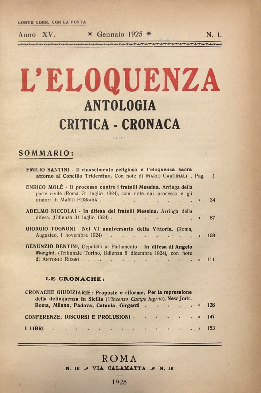 L'eloquenza. Antologia, critica, cronaca. Anno XV - 1925 | Libri antichi e moderni | Bentini G. - Federzoni L. - Ferri E. - Niccolai A. Et Alii