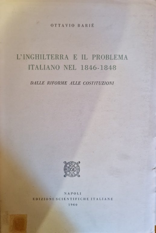 L'Inghilterra e il problema italiano nel 1846-1848 Dalle riforme alle costituzioni | Libri antichi e moderni | Ottavio Barié, ,Ottavio Barié