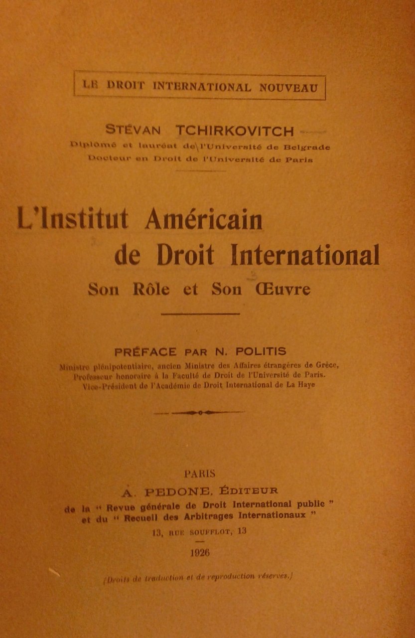 L'Institut Americain de Droit International son role et son oeuvre. Preface par N. Politis | Libri antichi e moderni | Tchirkovitch Stevan