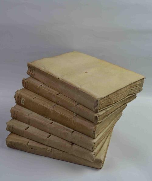 Sei volumi di cm. 23, pp. oltre 2.500 complessive. Stemma arcadico a ciascun frontespizio, ritratto del Caraffa cui l'opera è dedicata, ritratto dell'autore ed una tavola raffigurante il Bosco Parrasio, queste ultime poste al sesto volume dove appaiono anche 45 vignette xilografiche nel testo. Leg. coeva in piena pergamena rigida con nervi passanti e titoli manoscritti ai dorsi. Timbretto di biblioteca privata (Colonna di Roma). Esemplare con qualche fioritura sparsa ed alcuni piccoli rinforzi al margine bianco delle ultime carte di alcuni volumi, peraltro genuino ed in buono stato di conservazione. Si tratta della più ampia e completa edizione di questa storia letteraria apparsa in originale nel 1698 in un solo volume. Cfr. Piantanida, 3575: "La migliore edizione. e la prima completa" e Gamba (2212).