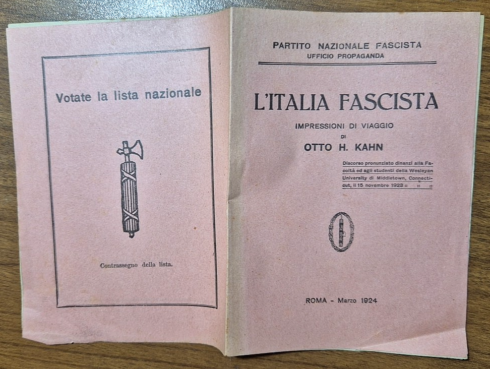 L'ITALIA FASCISTA di Otto H. Kahn, Impressioni di viaggio Partito Nazionale Fascista, ufficio propaganda, 1924. 16 pagine. Copertina editoriale in carta. Stato di conservazione: molto buono (pagine normalmente ingiallite, angolino inferiore destro piegato).