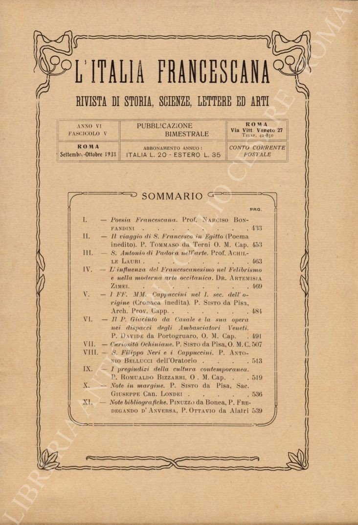 L'Italia francescana. Rivista di Storia, Scienze, Lettere ed Arti | Libri antichi e moderni | Autori Vari