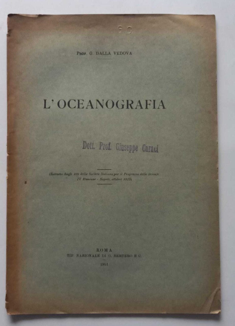 L'Oceanografia. Estratto dagli Atti della Soc. Italiana per il progresso delle scienze IV riunione, Napoli ottobre 1910. La brossura editoriale del fascicolo presenta bruniture ai bordi, pagine ingiallite ma buone. Sul piatto il timbro del Prof. Giuseppe Caraci (volume dismesso). 19 Buono (Good) .