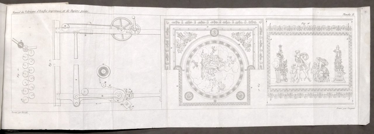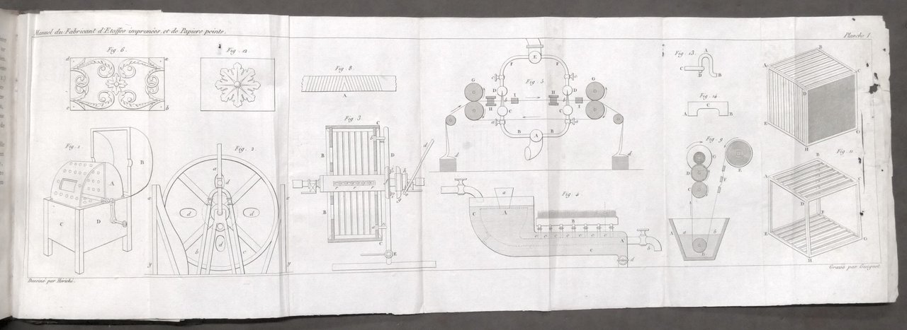Manuel du fabricant d'étoffes imprimées et du fabricant de papiers peints : contenant les procédés les plus nuveaux pour imprimer les étoffes de coton . par L. Séb. Le Normand Paris, à la Librairie encyclopédique de Roret, 1830 Pag. IX, 342 Con due tavole ripiegate. Legatura in pelle - Testo in francese. Buone condizioni. Lievi tracce di umidità su alcune pagine.
