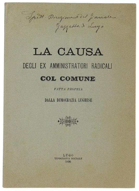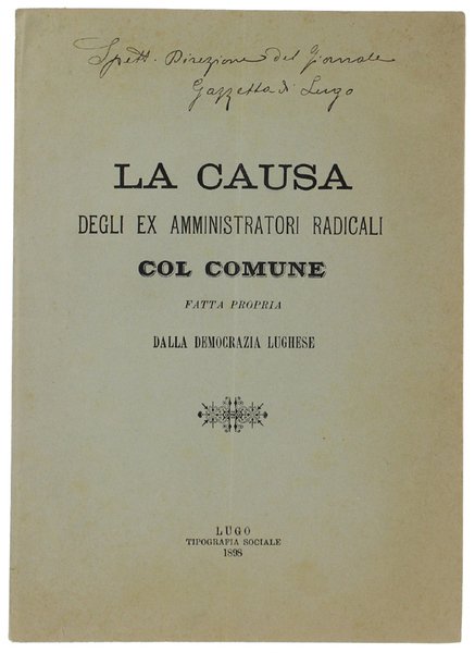 LA CAUSA DEGLI EX AMMNINISTRATORI RADICALI COL COMUNE FATTA PROPRIA DALLA DEMOCRAZIA LUGHESE. | Libri antichi e moderni |