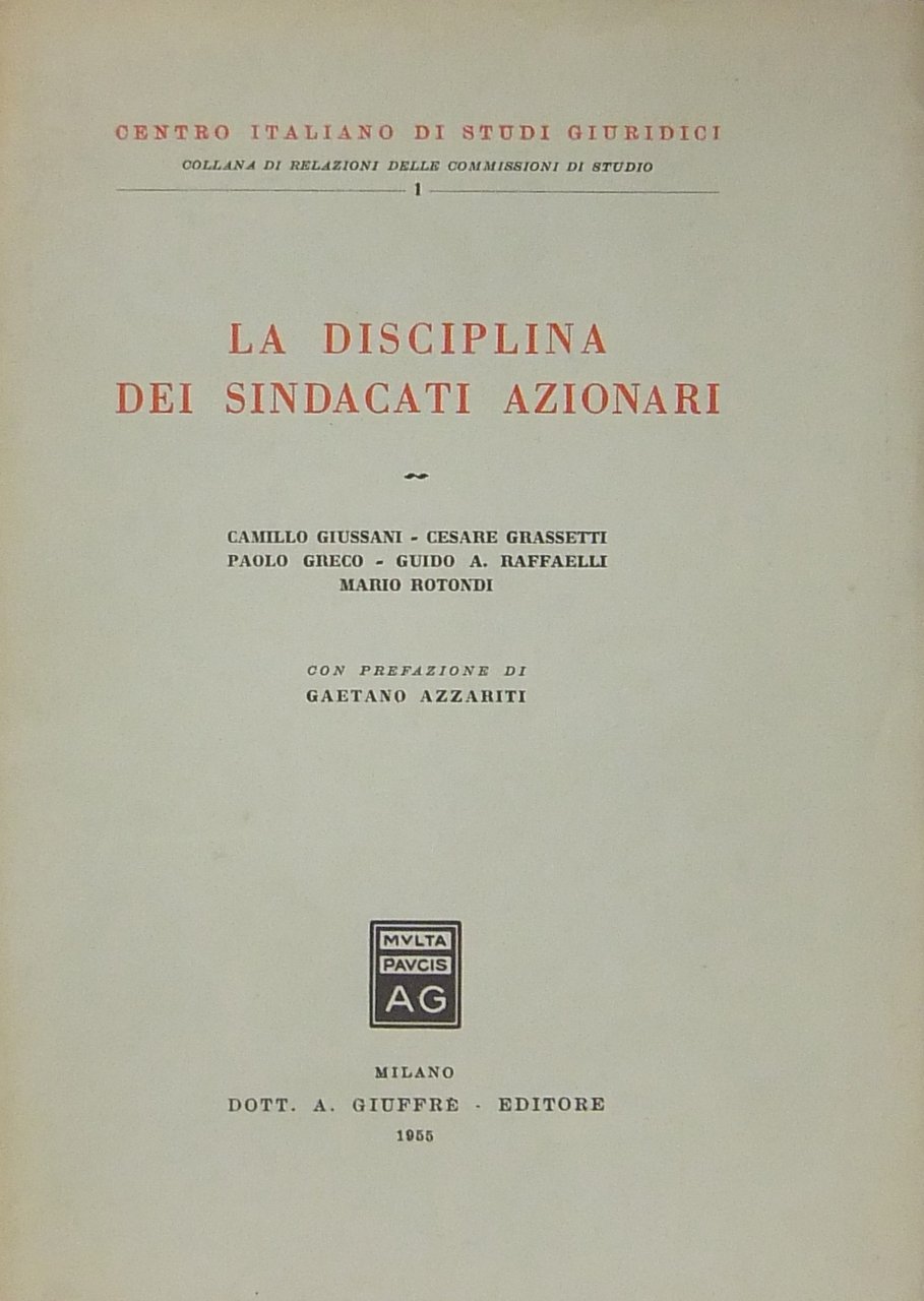 La disciplina dei sindacati azionari. Prefazione di Gaetano Azzariti | Libri antichi e moderni | Giussani C. - Grassetti C. - Greco P. - Raffaelli G.A. - Rotondi, M.