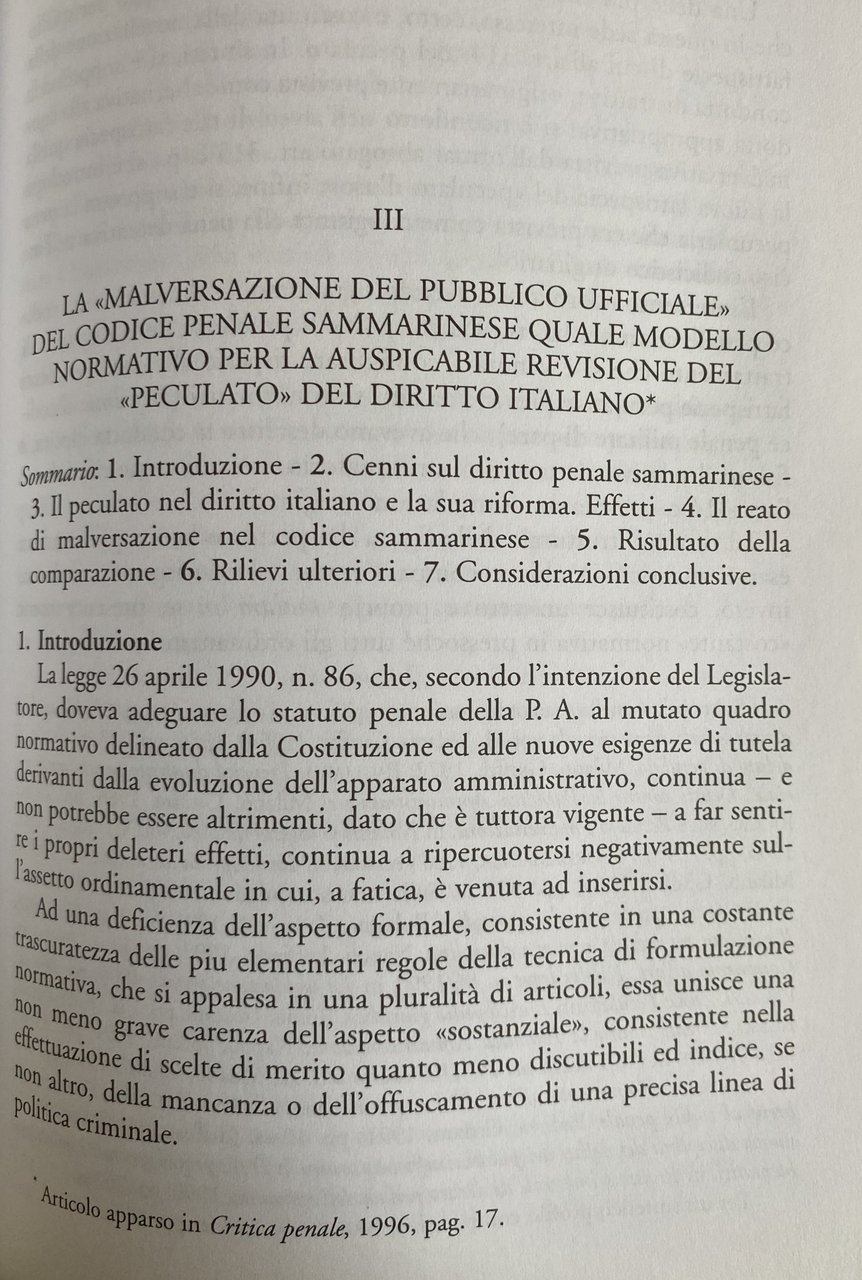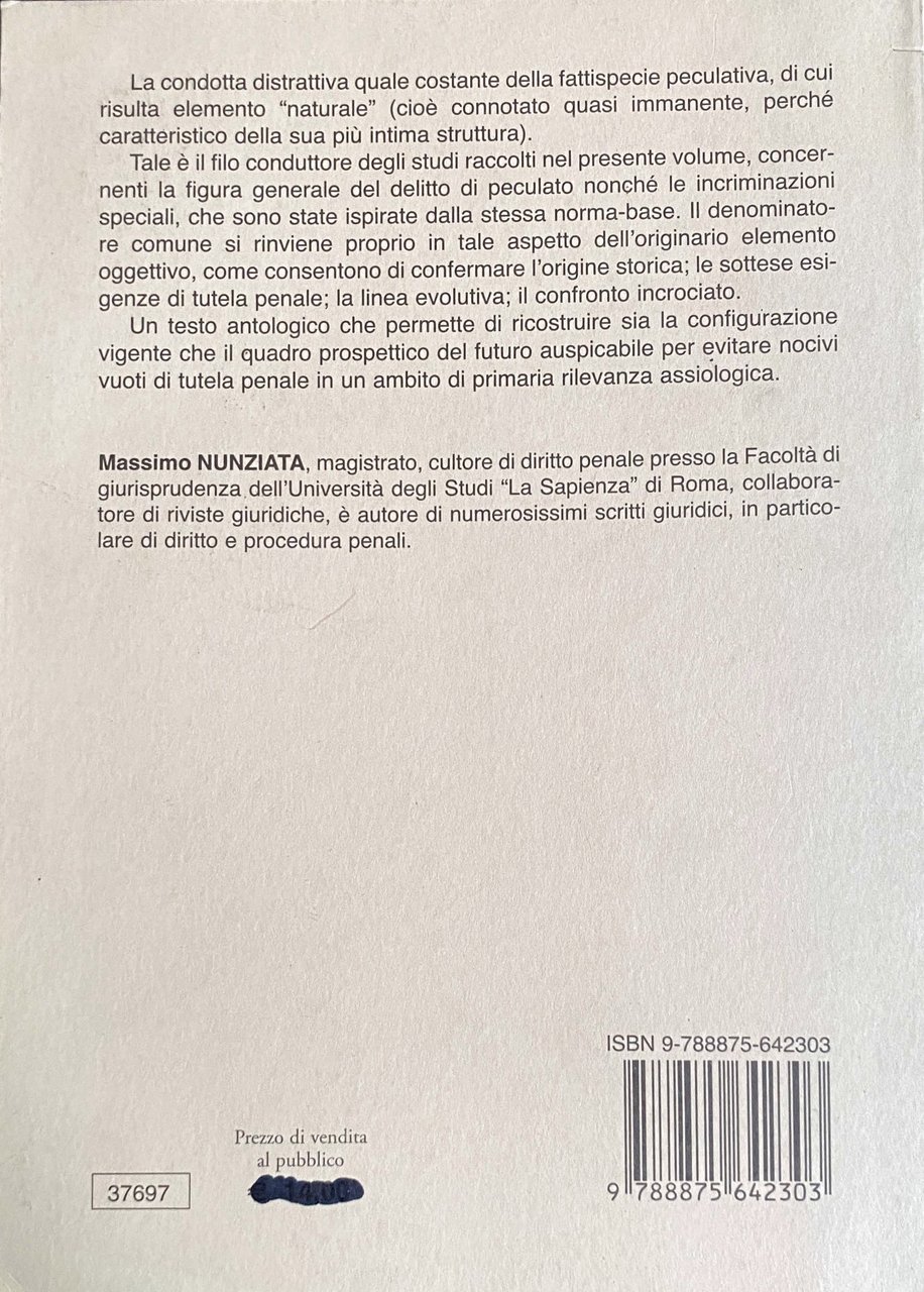 - Diritto penale, Giurisprudenza, Università, Scritti giuridici, Procedura penale, Critica giuridica, Delitto, Peculato, Riforma, Codice penale, Giustizia, Malversazione, Pubblico ufficiale, Diritto Militare, Guardia di Finanza, Cassazione, Reati, Abuso, Abuso d'ufficio, Abusi, Delitti, Lavoro, Iure condendo, Prestazioni lavorative, Pubblica Amministrazione, Pubblica sicurezza, Polizia, Legislazione, Fattispecie incriminatrici, Fattispecie giuridiche, Bibliografia, Riferimento, Libri rari, Libri fuori catalogo, Saggi, Dottrina, Dibattito, Fonti giuridiche, Teoria, Pratica, Prassi, Illecito, Sanzioni, Lezioni, Manuali universitari, Illecuti, Appropriazione indebita, Distrazione, Pena, Interdizione perpetua, Pubblici uffici, Incapacità, Profitto, Concussione, Dolo, Normativa