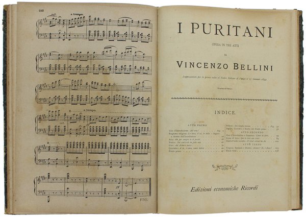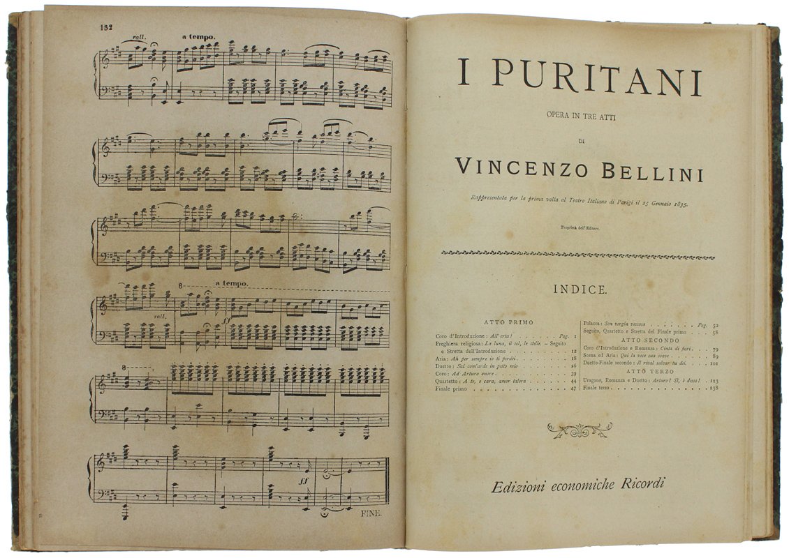 (Codice ZA/0157) In 4º (30,5 cm) 132 pp. Segue, legato nello stesso volume:Vincenzo Bellini: "I PURITANI", Opera in tre atti, 148 pp. Carta ingiallita, titolo manoscritto alla sguardia. Legatura mezza pelle coeva, titolo oro. Buono stato. ~~~ SPEDIZIONE IN ITALIA SEMPRE TRACCIATA