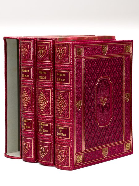 Illustrations de Jean Gradassi "Le Miniaturiste", un des 350 exemplaires numérotés de 351 à 700 (n° 520) enrichis d'une illustrations originale en couleurs et d'une suite en gris de payne des illustrations hors texte, 3 vol. in-4 reliure éditeur plein chagrin grenat estampé à froid et richement orné sous étuis bordés, tête dorée, Achevé d'Imprimer sur les Presses de de la Société Le Chant des Sphères sous la direction de Joseph Pardo, Editions Arts et Couleurs, Editions Sefer JP, Monte Carlo, 1978 - 1979 Bel exemplaire du tirage à 350 exemplaires enrichi d'une planche originale en couleurs (en l'espèce il s'agit de la planche "Le Grand Ferré") et de la suite en gris. Le célèbre miniaturiste Jean Gradassi illustre ici le chef-d'oeuvre de l'archiviste et historien Siméon Luce (1833-1892) qui rassemble sous ce titre des études très diverses sur la période, dont nous donnons quelques exemples : "La mort de Charles V" ; "Perrette de La Rivière, dame de la Roche-Guyon" ; "Louis d'Estouteville et la défense du Mont-Saint-Michel" ; "Jeanne Paynel à Chantilly", etc. etc. Louis Gautier put écrire de l'historien : "personne n'a mieux connu cette désastreuse époque, personne ne l'a mieux jugée. On peut dire qu'il fréquentait personellement tous les acteurs de ce grand drame, et qu'il était jour par jour au courant de leurs moindres affaires". Bel exemplaire (petit mouchetage sur le plat d'un étui, parfait état par ailleurs).