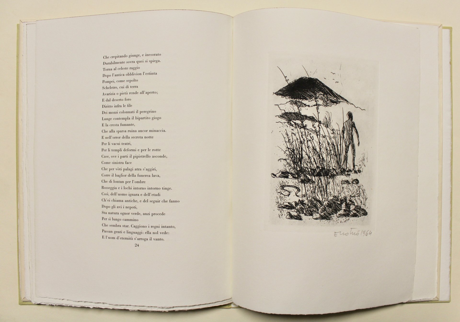 In Folio (mm 375x280). Pagg. 27, (7), con 2 acqueforti firmata di Enotrio Pugliese, 1 foglio a sé stante contenente la poesia "Infinito". Testo italiano. Tiratura in 150 esemplari numerati (n° 49) impressi a mano su carta a tino di Fabriano in carattere Bodoni Antiqua tondo c. 14. Brossura color panna; custodia di cartone robusto verde chiaro.<BR>"La Ginestra" è l'ultimo canto composto da Giacomo Leopardi (1798-1837) e in esso, per così dire, egli consegna ai lettori le conclusioni cui è giunto. Alla filosofia spiritualistica ed in genere agli ideali e alle vane illusioni cui l'uomo del suo tempo pareva volgersi per negarsi alla realtà della condizione umana, il poeta contrappone un sentimento di fratellanza e stoica sopportazione nei confronti di una natura che sentiva "matrigna". Il Vesuvio, un tempo verde e fiorente, diviene quindi il simbolo della natura apparentemente benigna che, all'improvviso, spazza via ogni cosa con la sua furia, compreso l'uomo e tutte le sue illusioni. In tale terreno avverso riesce tuttavia a vivere l'odorata e lenta ginestra, che Leopardi propone a simbolo dell' eroica tenacia nel deserto dell'esistenza. L'uomo deve essere capace di reagire alle avversità dell'esistenza come la ginestra, che si piega alla violenza della natura, ma sa reagire e ricrescere.<BR>Enotrio Pugliese (1920-1989), nato a Buenos Aires da emigranti calabresi e rientrato in Italia nel 1926, fu particolarmente attento alle cause che spingevano migliaia di persone a tentare la fortuna in terre lontane. Nella sua opera, pittorica e d'incisione, è stato sensibile interprete delle bellezze naturali ma anche della miseria e delle speranze della Calabria, alla quale rimase molto legato per tutta la vita.<BR>Catalogo Editiones Dominicae, 27.<BR>