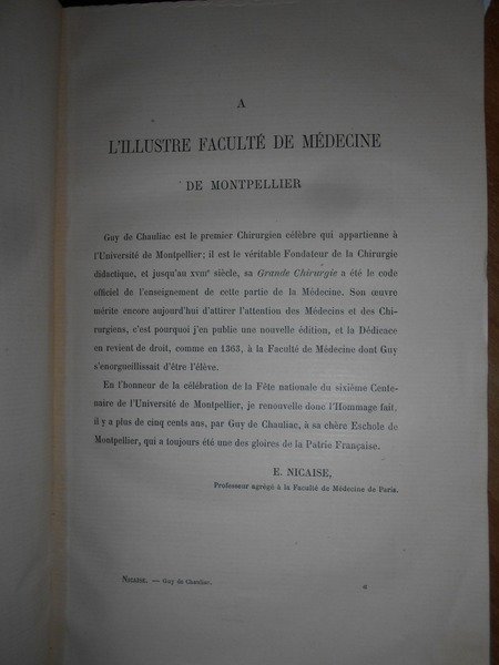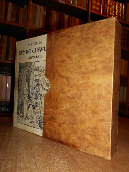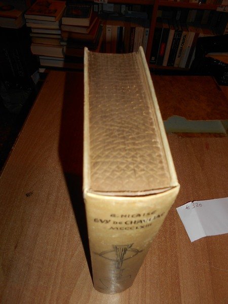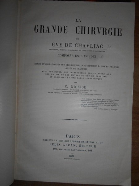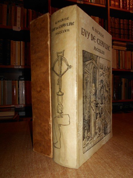 E. NICAISE. Paris, Fèlix Alcan, 1890. La Grande Chirurgie de Guy De Chavliac MCCCLXIII. Revue et collationée sur les manuscrits et imprimés latins et français ornée de gravures. In-8°, cartonato edit. illustrato ai piani e nel dorso. CXCI, 747 pp. con 4 tavole n.t. che illustrano vari strumenti chirurgici dell' epoca. Ottimo esemplare con lievi segni del tempo nelle copertine e nell' astuccio. Uff. C - III - 7