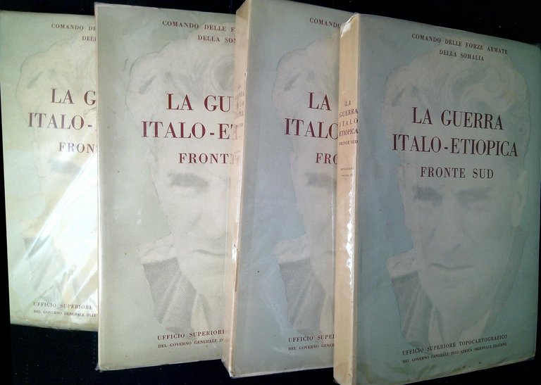 Comando delle forze armate della Somalia La guerra italo-etiopica : fronte sud. Quattro volumi, opera completa. Addis Abeba, Ufficio superiore topocartografico del Governo generale dell'AOI 1937, Quattro volumi, 26 cm. In splendido stato di conservazione (73112)