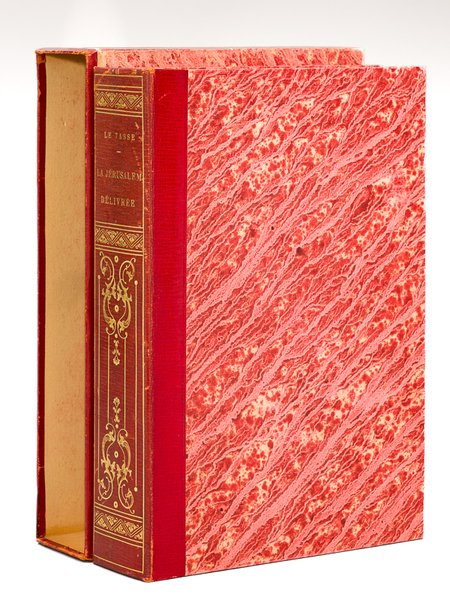 Traduction nouvelle et en prose par M. V. Philipon de la Madelaine, augmentée d'une description de Jérusalem par M. de Lamartine, édition illustrée par Mm. Baron et C. Nanteuil, 1 vol. grand in-8 br. sous couverture postérieure cartonnée sous chemise en demi-maroquin à grains long imitant une reliure romantique et étui bordé, J. Mallet et Cie, Paris, 1841, 4 ff., XX-525 pp. et 1 f. n. ch. avec portrait du Tasse en frontispice, 21 figures hors texte gravées sur bois, sans légende, tirées sur chine appliqué et au moins 150 vignettes sur bois dans le texte Curieux exemplaire rapporté dans une modeste couverture postérieure et conservé sous une belle chemise sous étui, de belle provenance (ex-libris Paul Gavault, lég. frott. à l'étui, rouss.).