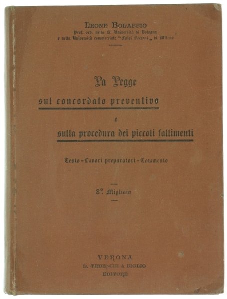 LA LEGGE SUL CONCORDATO PREVENTIVO E SULLA PROCEDURA DEI PICCOLI FALLIMENTI. Testo - Lavori preparatori - Commento. | Libri antichi e moderni | Bolaffio Leone.