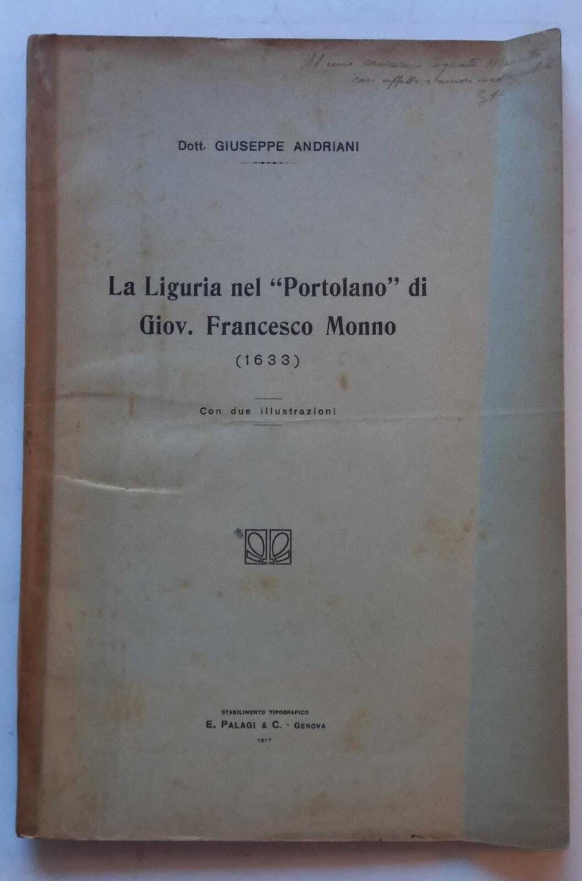 La Liguria nel "Portolano" di Giov. Francesco Monno (1633), estratto dagli Atti della Societò ligusticadi Scienze naturali e Geografiche Anno XXVII - Volume XXVII N. 3-4. La copertina del volume riporta fioriture varie, l'interno ingiallito è in buono stato. Sul piatto una dedica dell'Autore. 48 Buono (Good) .