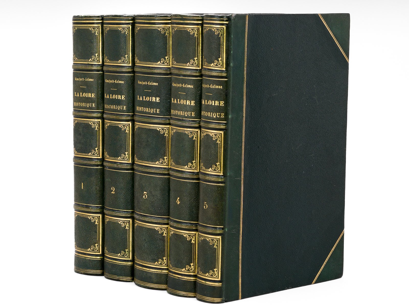5 vol. grand in-8 reliure de l'époque demi-chagrin à coins vert, dos à 4 nerfs dorés orné, double filet doré en mors et coins, tête dorée, Chez Lecesne, Tours, et Chez les Principaux Libraires de France, 1851, 2 ff., XXXV-706 pp.; 2 ff., 700 pp. ; 2 ff., 924 pp.; 2 ff., 731 pp. ; 2 ff., 524 pp. avec 62 planches hors-texte (y compris le portrait en frontispice), 3 cartes dépliantes et nombreuses figures dans le texte Bon exemplaire de cet ouvrage classique en jolie reliure d'époque. L'ouvrage suite le cours de la Loire à travers Ardèche et Haute-Loire, Loire et Saône-et-Loire, Allier, Nièvre et Cher, Indre-et-Loire, Maine-et-Loire et Loire-Inférieure (désormais Loire-Atlantique). Bon exemplaire en très bon état (très petites traces d'usage, ancien cachet d'ex-libris Bailey-Dutillieux Fabricants de Tulles à Douai, et ex-libris gravé Robert Thibaut)