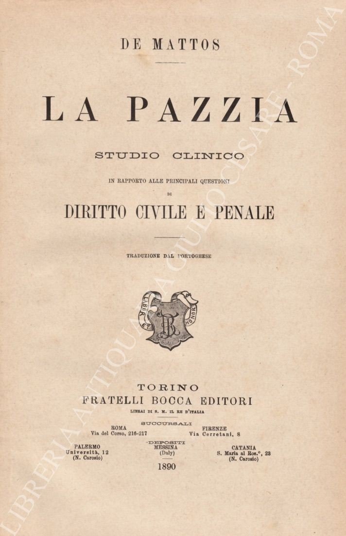 La pazzia. Studio clinico in rapporto alle principali questioni di diritto civile e penale. Traduzione dal portoghese | Libri antichi e moderni | Teixeira De Mattos Vittore