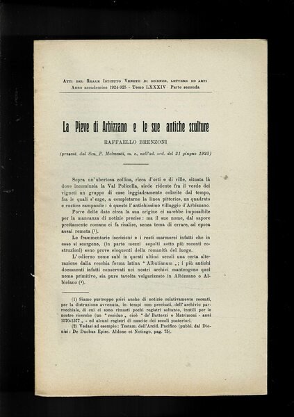 La Pieve di Arbizzano e le sue antiche sculture. Estratto dagli Atti del Reale Istituto Veneto di scienze lettere e arti del 1924-1925. | Libri antichi e moderni | Brenzoni Raffaello.