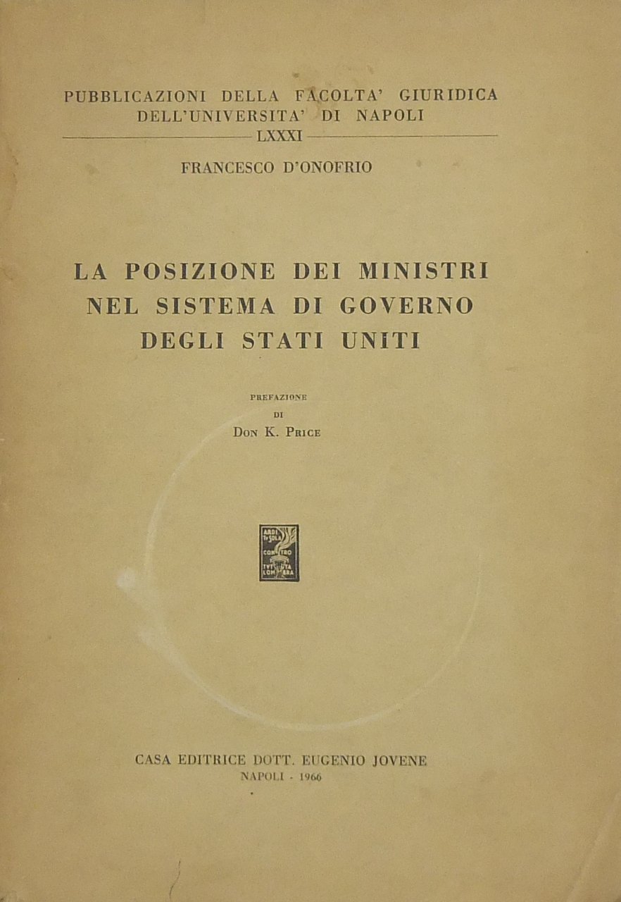 La posizione dei ministri nel sistema di governo degli Stati Uniti. Prefazione di Don K. Price | Libri antichi e moderni | D'Onofrio Francesco