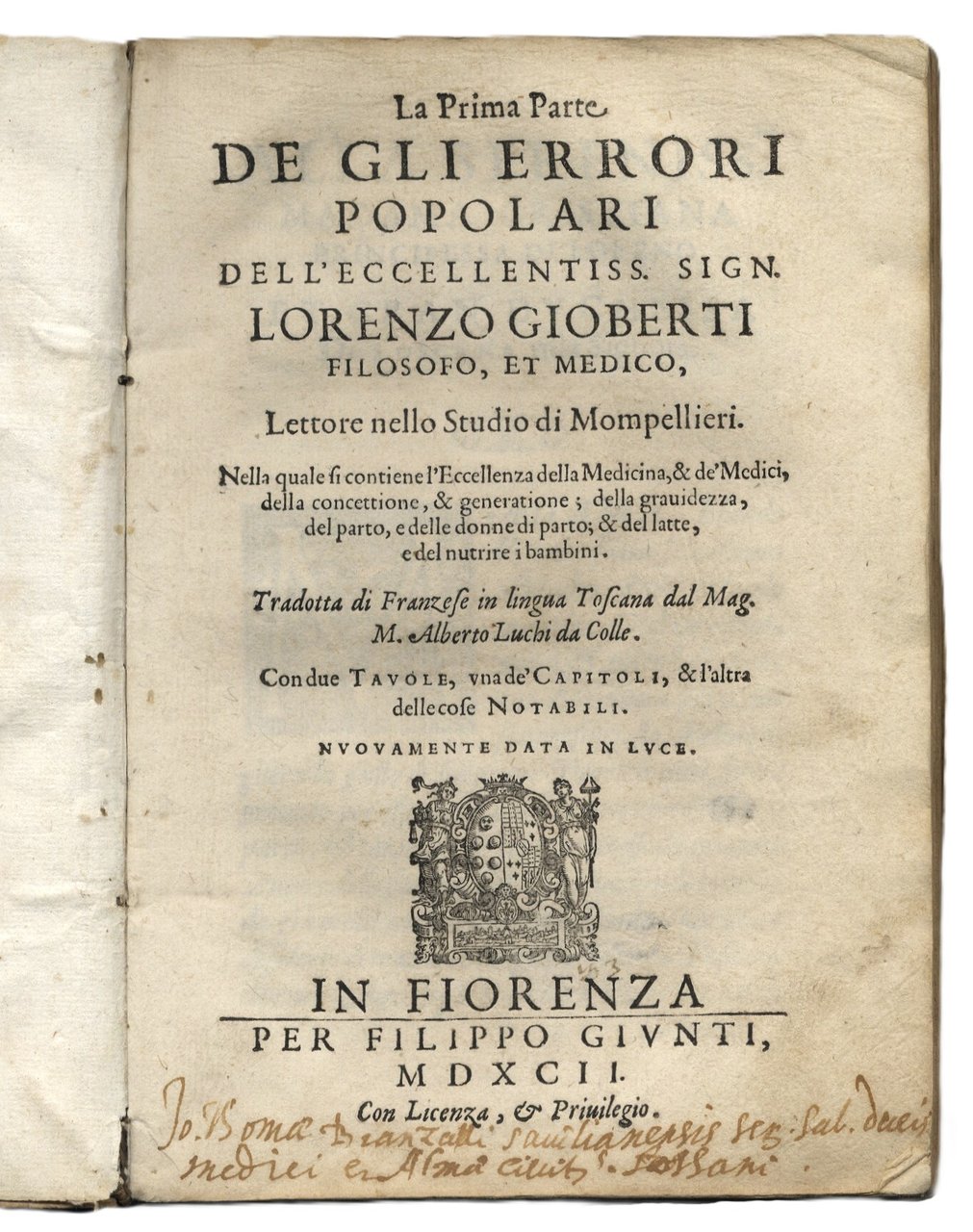 La Prima parte de gli Errori Popolari ...nel quale si contiene l'eccellenza della medicina, et de medici ... della gravidanza, del parto e delle donne di parto. Tradotta dal franzese in lingua toscana dal Mag. M. Alberto Luchi da Colle.