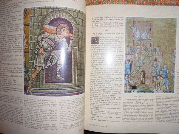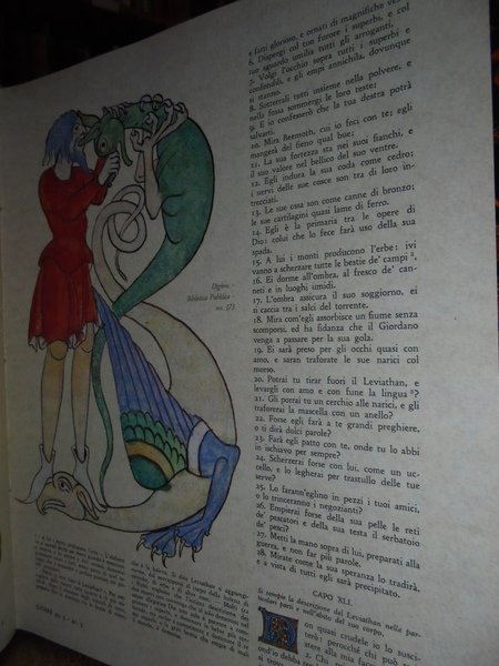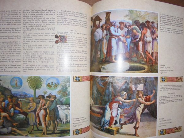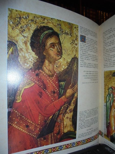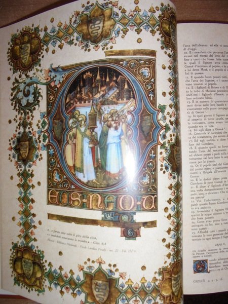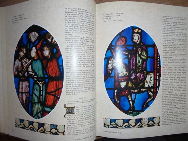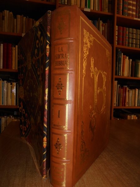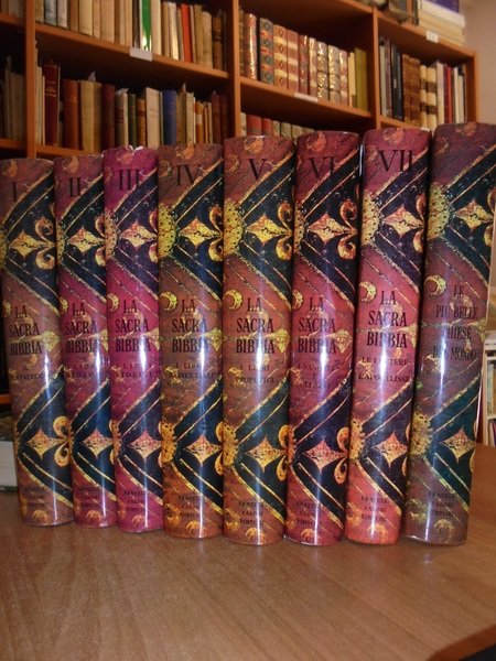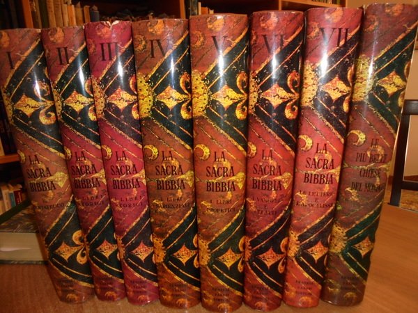 La Sacra Bibbia. Antico e nuovo Testamento. Traduzione di Monsignor Antonio Martini. Revisione di Monsignor Luigi Nazari di Calabiana. 8 volumi in-4°, similpelle con fregi e titoli in oro nei piani e sui dorsi con le sovracopertine. Piano generale dell' opera: Vol. I. Il Pentateuco di 400 pp. Vol. II. I Libri storici (da Giosuè ai 4 Libri del Re) di 336 pp. Vol. III. I Libri storici (dai Paralipomeni ai Maccabei) di 336 pp. Voll. IV. I Libri Sapienzali (da Giobbe a l' Ecclesiastico) di 432 pp. Vol. V. I Libri profetici di 435 pp. Vol. VI. I 4 Vangeli e gli Atti degli Apostoli di 380 pp. Vol. VII. Le Lettere degli Apostoli e l' Apocalisse di 396 pp. contenenti centinaia di illustrazioni tutte a colori anche a mezza pagina. + Le più belle chiese del mondo una raccolta di innumerevoli tavole a colori con al verso la descrizione in un volume in-4°, similpelle con fregi in oro e sovracopertina. Lievi strappetti nei margini delle sovracopertine in un paio di volumi. 8 volumi in ottimo stato di conservazione. E' preferibile il ritiro presso il nostro negozio. Uff. stanzetta TV. pacco fatto a sinistra Carc.
