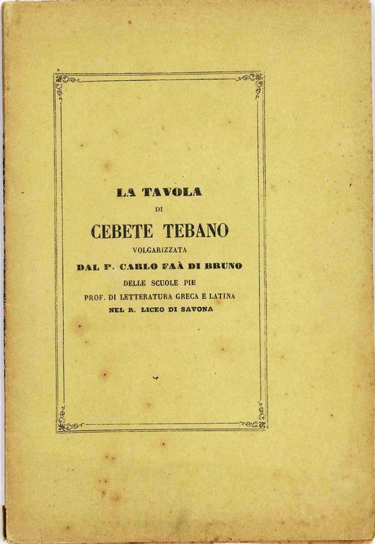 La Tavola di Cebete Tebano volgarizzata dal P. Carlo Faà di Bruno delle Scuole Pie. Prof. di letteratura greca e latina nel R. Liceo di Savona.