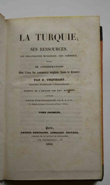 La Turquie; ses ressources, son organisation municipale, son commerce, suivis des considérations sur l'état du commerce anglais dans le Levant. Traduit de l'Anglais par Xav. Raymond. Ouvrage précédé d'une Introduction par M.G.D.E., Ex-Membre du bureau d'économie publique à Athènes. | Libri antichi e moderni | Urquhart David.