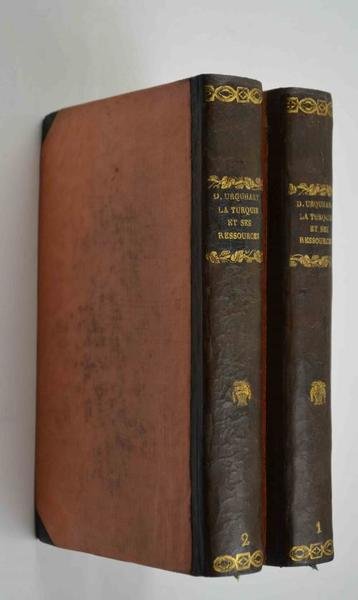 Tre parti in due volumi di cm. 21, pp. vii (1) 472; (6) vi, 240; (4) 256. Con una carta geografica stampata su carta forte e più volte ripiegata f.t. Legatura del tempo in mezza pelle con punte, dorsi lisci con titoli e fregi in oro. Qualche fioritura sparsa alle carte di testo e segni di abile restauro alle legature, complessivamente opera genuina e ben conservata. Prima edizione francese di quest'opera che offre una completa panoramica sullo stato della Turchia della prima metà dell'800. Interessante e non comune.