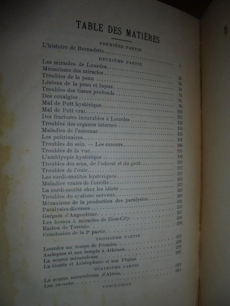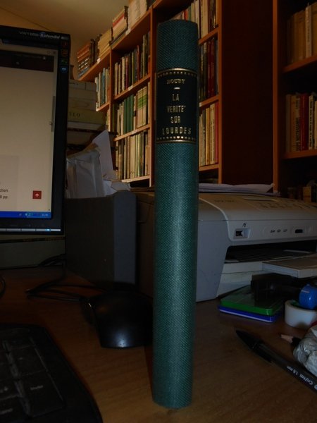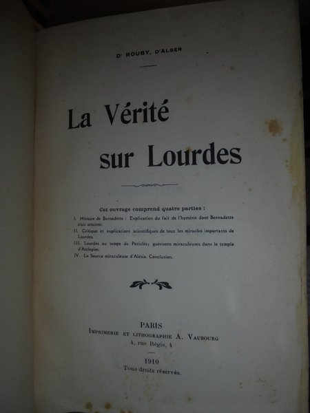 Rouby, d' Alger, Paris, Inprimerie et Lithographie A. Vaubourg, 1910. La Vérité sur Lourdes. In-8°, tela verde con titolo in oro entro tassello al dorso, brossure originali conservate. 319, (1) pp. Esemplare in legatura nuova con le copertine originali conservate. Qualche lieve arrossatura sparsa me ben conservato. Neg. mens. bianca cassa