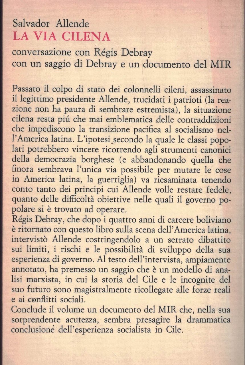 LA VIA CILENA. Conversazione con RÚgis Debray. Con un saggio di Debray e undocumento del MIR. Traduzione di Fiorella Pasini. | Libri antichi e moderni | Salvador Allende, ,Salvador Allende