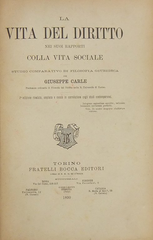 La vita del diritto nei suoi rapporti colla vita sociale. Studio comparativo di Filosofia Giuridica | Libri antichi e moderni | Carle Giuseppe (1845-1917)