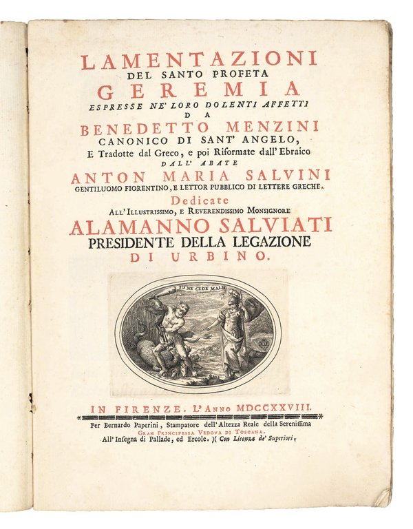 Lamentazioni del santo profeta Geremia espresse ne' loro dolenti affetti da Benedetto Menzini canonico di Sant'Angelo, e tradotte dal greco, e poi riformate dall'ebraico dall'abate Anton Maria Salvini gentiluomo Fiorentino, e lettor pubblico di lettere greche [...].