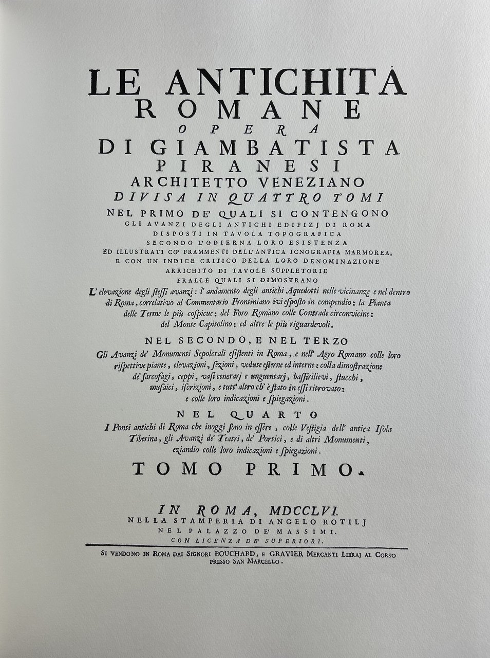 Le antichità romane. Vol. I - Gli avanzi degli antichi edifici di Roma disposti in tavola topografica secondo l'odierna loro esistenza ed illustrati co' frammenti dell'antica iconografia marmorea e con un indice critico della loro denominazione arrichito di tavole suppletorie; Vol. II - Gli avanzi de' monumenti sepolcrali di Roma e dell'agro romano | Libri antichi e moderni | Piranesi Giovanni Battista