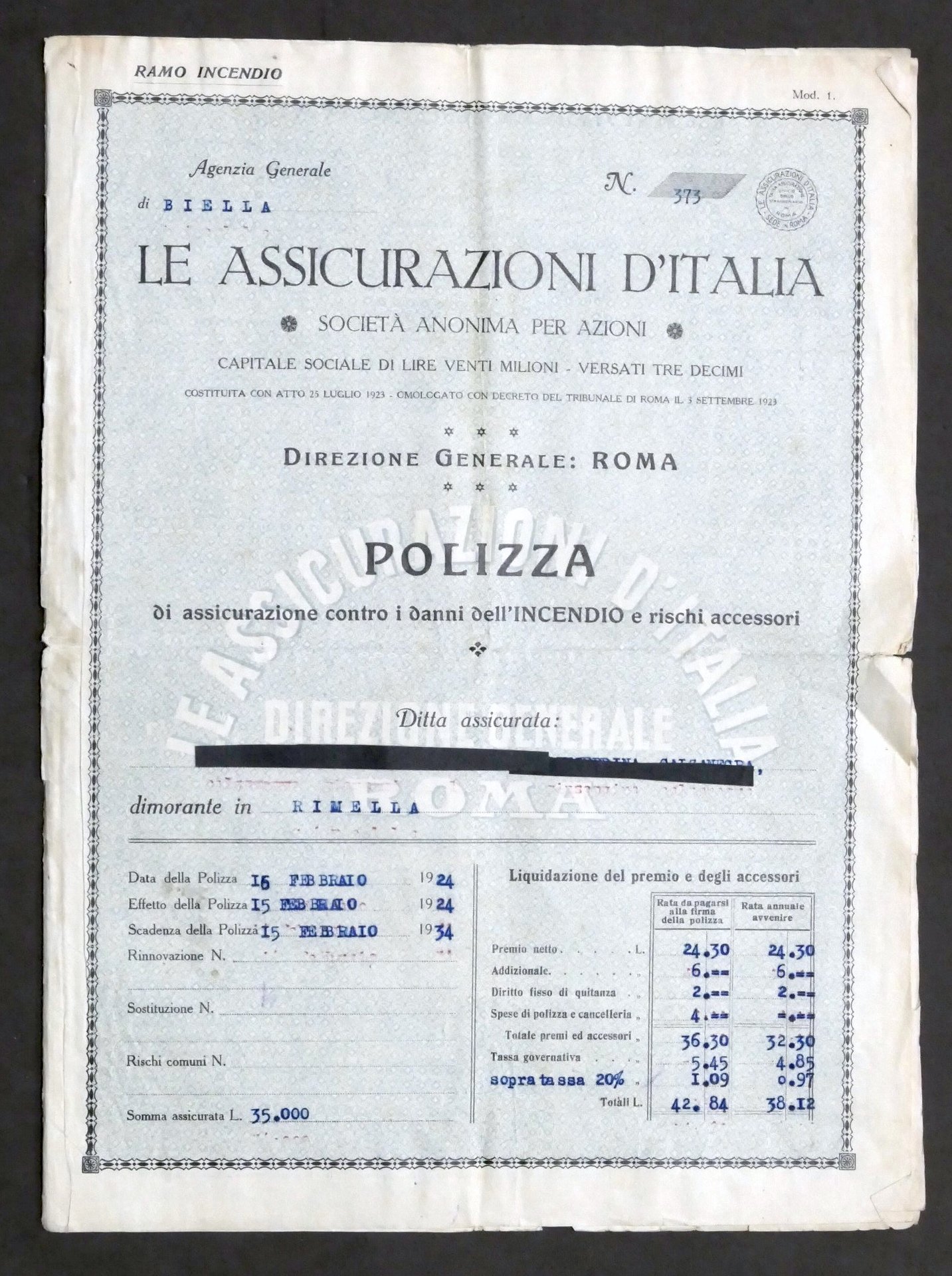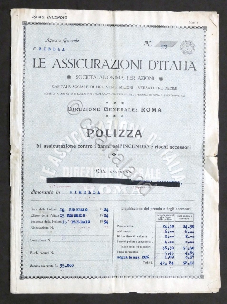 Le Assicurazioni d'Italia - Polizza contro i danni dall'incendio - Biella - 1924