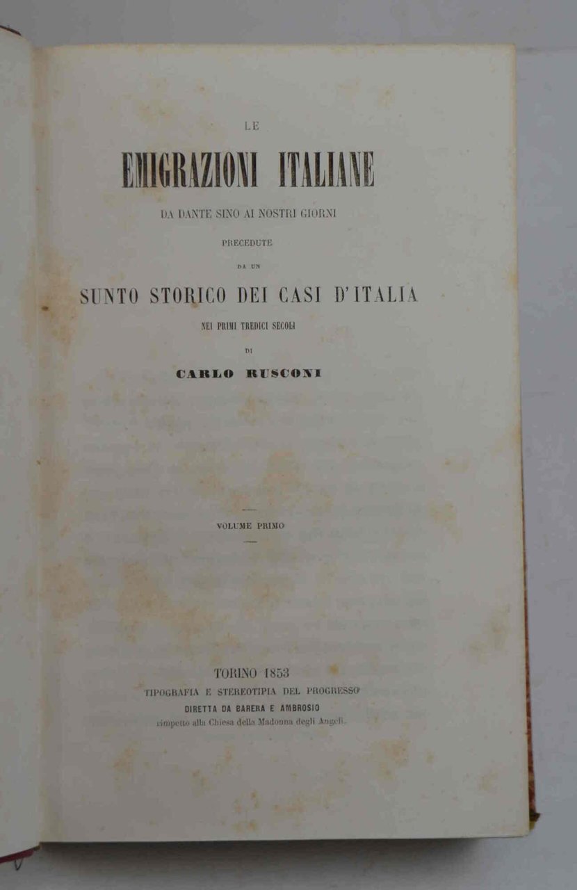 Le emigrazioni italiane da Dante sino ai giorni nostri precedute da un sunto storico dei casi d'Italia nei primi tredici secoli... | Libri antichi e moderni | RUSCONI CARLO.
