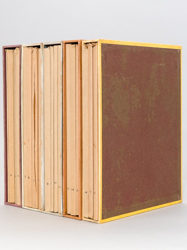 18 numéros en feuillets sous chemise, recueillis sous 5 étuis, Le Livre et ses Amis. Revue mensuelle de l'art du Livre, 1945-1946-1947, tirages sur vélin du tirage principal, numéroté Bon ensemble (dos du numéro 7 coupé sur la longueur, bon exemplaire par ailleurs) réunissant les 18 numéros sous 5 étuis solides.
