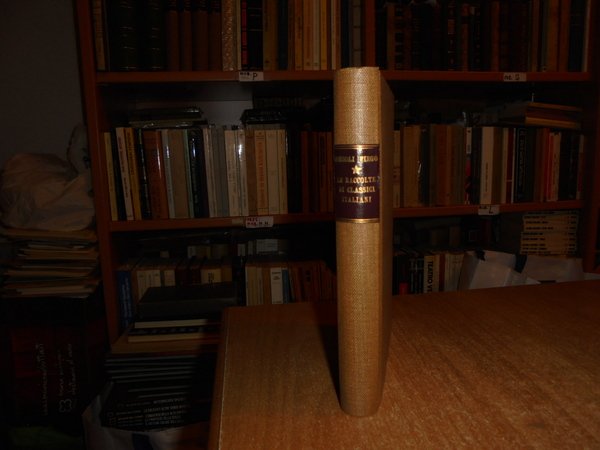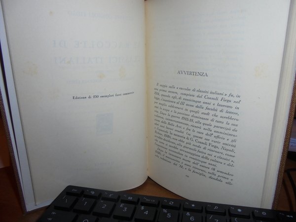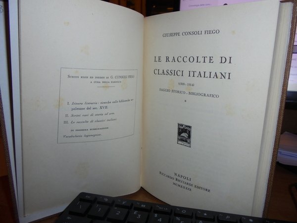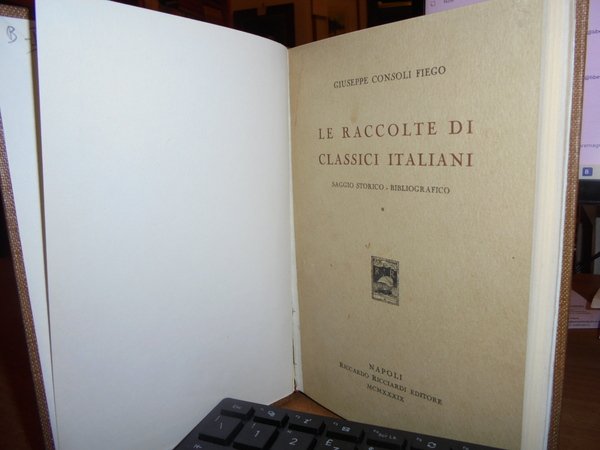 GIUSEPPE CONSOLI FIEGO. Napoli, Riccardo Ricciardi Editore, 1939. LE RACCOLTE DI CLASSICI ITALIANI (1500 - 1914). Saggio Storico - Bibliografico. In-16° grande, tela con titolo in oro entro tassello al dorso, copertine originali conservate. viii, 279 pp. Edizione di 250 esemplari fuori commercio. Perfetto stato di conservazione. Uff. B - II - 4 - 2