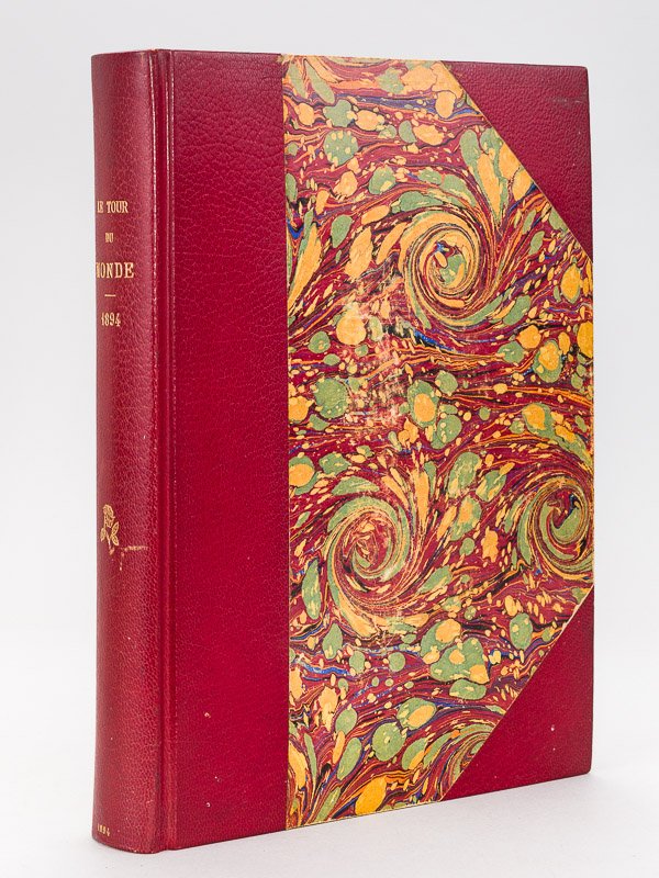 Publié sous la direction de M. Edouard Charton, et illustré par nos plus célèbres artistes, 1 vol. in-4 reliure demi-maroquin à coins rouge, dos lisse orné d'une rose, tête dorée, date en queue, reliure signée de Carayon, Librairie Hachette et Cie, Paris, Londres, 1894, 2 ff., 427 pp., 2 ff. 428 pp., 1 f. n. ch. Le Tour du Monde. Nouveau Journal des Voyages [ Année 1894 Complète - Exemplaire sur Papier de Chine. Premier Semestre et Second Semestre, Tomes LXIII et LXIV ] La Sicile. Par Gaston Vuillier - Voyage aux Iles Séchelles par Charles Alluaud - Voyage à la Nouvelle-Zemble par M. Constantin Nossiloff - Aux Pics d'Europe par Paul Labrouche et le Comte de Saint-Saud - Six semaines sur le Nil, par E. Cotteau - De Pékin à Paris : la Corée, l'Amour et la Sibérie par Charles Vapereau - Baume-les-Messieurs par Edmond Renauld - A travers la Toscane par Eugène Muntz - Voyage à Madagascar par le docteur Louis Catat - Trois semaines chez les indiens Cayapas (République de l'Ecuador)- Bangkok par Lucien Fournereau - Au Dahomeu, par Alexandre L. d'Albéca - Six mois dans l'Inde - A travers l'Ardenne française par Rayeur - Aux monuments anciens des Kiams par Charles Lemire Très rare exemplaire du magnifique tirage sur papier de chine, dont Vicaire signale qu'il fut tiré quelques exemplaires (Vicaire, VII, 870-874). Bon état (rel. lég. frottée, coins lég. frottés, très petite griffure en dos, rares rouss. mais belle fraîcheur intérieure générale) pour ce remarquable tirage sur ce fin papier de chine qui fait ressortir superbement les très nombreuses gravures sur bois dont l'ouvrage est illustré. Les plus longs récits de voyage diffusés dans "Le Tour du Monde" sont publiés sur plusieurs années de parution.