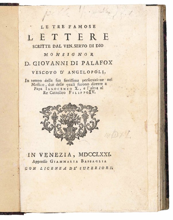 Le tre famose lettere scritte dal Ven. Servo di Dio Monsignor D. Giovanni di Palafox Vescovo d'Angelopoli, in tempo della sua fierissima persecuzione nel Messico, due delle quali furono dirette a papa Innocenzo X., e l'altra al re cattolico Filippo V [recte IV]