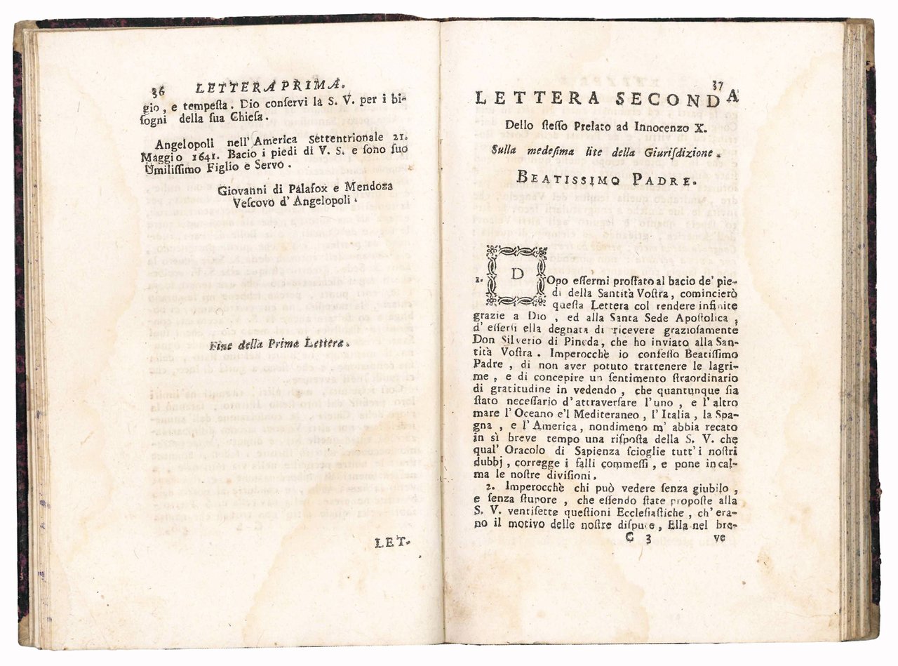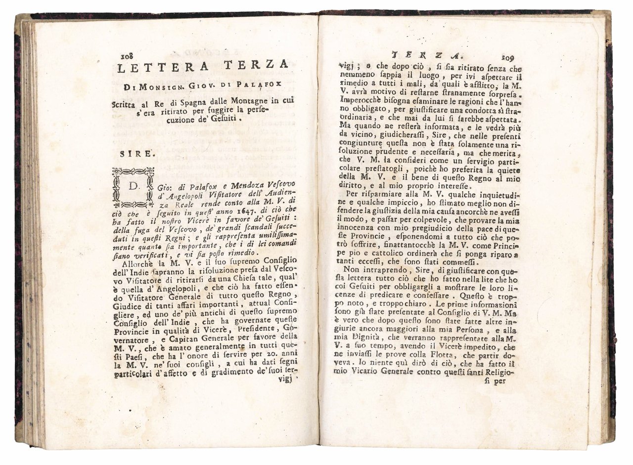 Le tre famose lettere scritte dal Ven. Servo di Dio Monsignor D. Giovanni di Palafox Vescovo d'Angelopoli, in tempo della sua fierissima persecuzione nel Messico, due delle quali furono dirette a papa Innocenzo X., e l'altra al re cattolico Filippo V [recte IV] | Libri antichi e moderni | PALAFOX Y MENDOZA, Juan de (1600-1659)