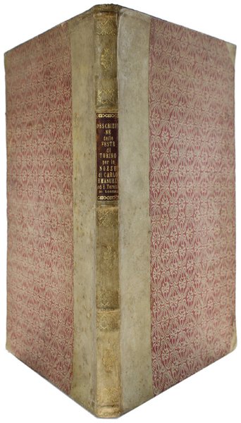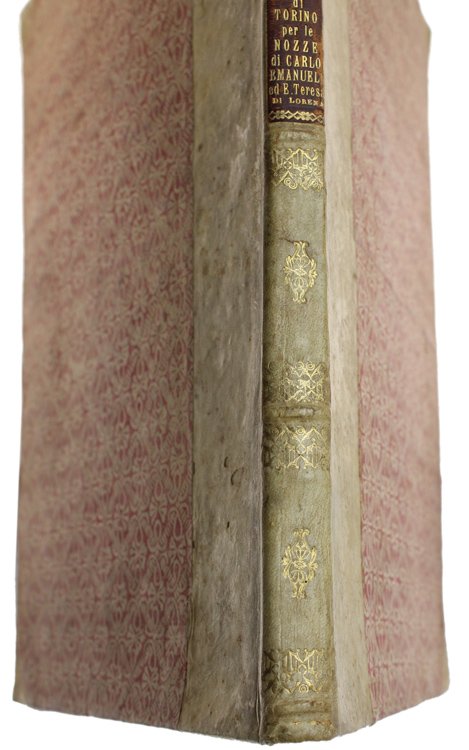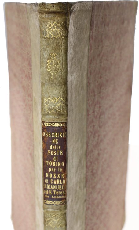 (Codice ZZ/0045) Autentica legatura settecentesca in mezza pergamena e angoli, interamente originale. Copertine in carta decorata con disegno in rosso, interni in carta avorio. Dimensioni cm 35,5x24,5, spessore circa cm 2. Al dorso titolo in oro su tassello in pelle rossa: "Descrizione delle Feste di Torino per le nozze di Carlo Emanuel ed E.Teresa di Lorena". La rilegatura conserva all'interno due fogli in carta verdina (sono le sguardie originali) e può ospitare un insieme di fogli spesso circa mm 7. Conservazione ottimale, vedi foto. ~~~ SPEDIZIONE IN ITALIA SEMPRE TRACCIATA